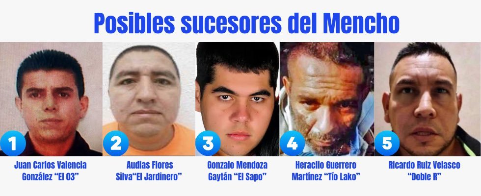 Los nombres que suenan como relevos no son secretos de Estado: Juan Carlos Valencia González, “El 03”; Audias Flores Silva, “El Jardinero”; Ricardo Ruiz Velasco, “Doble R”; Heraclio Guerrero Martínez, “Tío Lako”; Gonzalo Mendoza Gaitán, “El Sapo”. El crimen organizado no improvisa sucesiones: las administra.